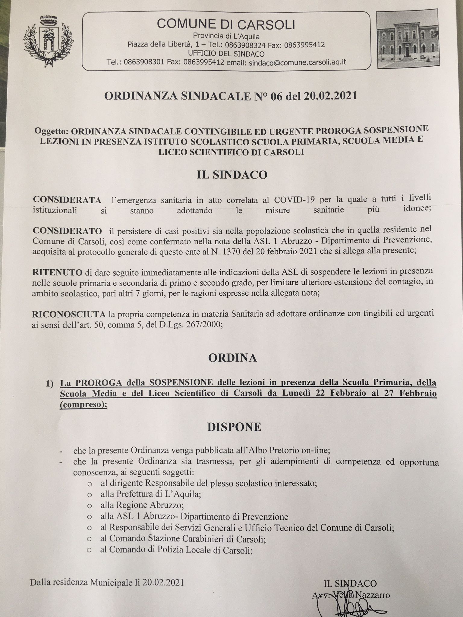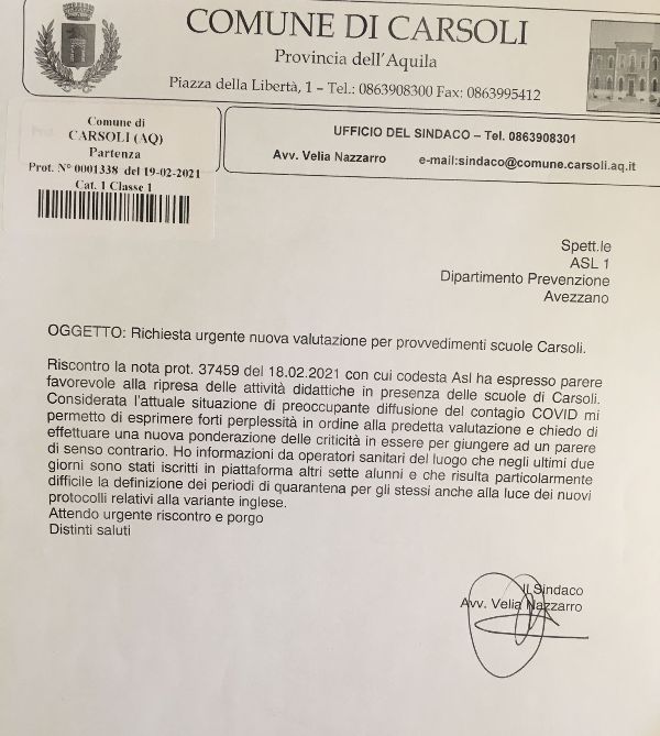 Carsoli – E’ stata disposta la chiusura degli edifici Scuola Elementare ed Istituto Omnicomprensivo di Carsoli con una nuova ordinanza del Sindaco Velia Nazzarro. “E’ stato intrapreso questo provvedimento – spiega il primo cittadino – in considerazione dell’evolversi della situazione epidemiologica nel nostro territorio comunale. Una situazione tenuta sotto costante controllo con i medici di base e che, per nostra valutazione, non presentava le condizioni ottimali e di sicurezza per far riprendere l’attività scolastica. E’ stato proprio in questo contesto, infatti, che i contagi si sono diffusi coinvolgendo intere famiglie. Il numero degli attuali contagiati non consente di riaprire in sicurezza nonostante interventi di sanificazione. Rispetto al parere favorevole della Asl, ritenuto non rispondente alle effettive esigenze di igiene e salute pubblica del territorio, ho dovuto riformulare il quesito, sul quale poi la medesima Asl ha riaggiornato il proprio parere uniformandolo a quello del sindaco”.