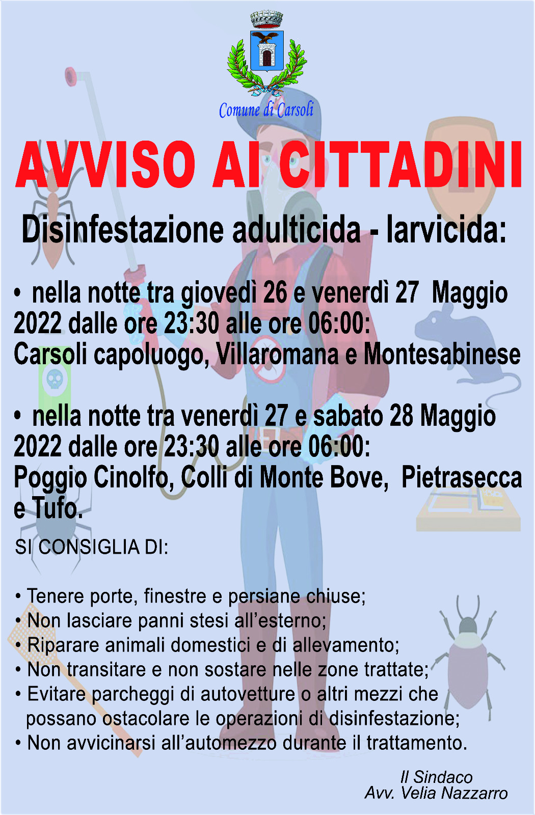 CARSOLI – Sono state disposte disinfestazioni nel territorio comunale di Carsoli, di seguito il dettaglio: