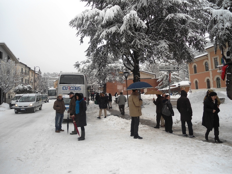 Ma ciò che farà ricordare quella notte, fu la chiusura dell’autostrada A24 in entrambi i sensi di marcia, disposta in seguito all’intensificazione delle precipitazioni, che dopo la cena di venerdì diventavano sempre più insidiose. Le previsioni, sicuramente meno precise di quelle attuali, pur prevedendo neve, non avevano certo evidenziato un pericolo simile, cosicchè Strada dei Parchi per evitare problemi pensò di chiudere tutto. Alle 23,00 del venerdì, ci trovammo nella condizione di dover assistere tanti automobilisti, camionisti, e gente letteralmente disperata ed in preda al panico. La colonna dei Tir spiegati, pullman di linea ebbe a formarsi già nel pomeriggio, con il blocco della circolazione dei mezzi pesanti, in una colonna che iniziava all’altezza del Centro Commerciale Carsoli 2, e poi destinata a proseguire fino ad oltre Civita di Oricola in direzione di Roma. Una Tiburtina quindi innevata, con una corsia occupata dal blocco, e con una autostrada poi chiusa. Ad un certo punto tutte le auto vennero obbligate in uscita al Casello di Carsoli. Ma la gente non poteva certo restare al gelo in macchina, nè vi erano le condizioni per raggiungere il centro cittadino a bordo. E quindi lasciate ovunque le auto, iniziarono a dirigersi presso le strutture pubbliche. Nessuno avvertì il Comune di quanto stesse accadendo, e quindi la giunta Mazzetti decise gioco forza di aprire le nostre strutture pubbliche per accogliere le persone. Si ebbe ad iniziare dal centro fieristico, in quanto più vicino all’autostrada, ed in pochi minuti, venimmo sommersi di persone da sistemare. Gente che chiedeva informazioni che non sapevamo e ne’ potevamo dare. E intanto la neve continuava ad aumentare nella sua coltre, che rendeva tutto ancorpiù disagiato. La mole di automobilisti cresceva di minuto in minuto, ed alcuni pullman di linea, riuscirono a trasportare gente fino al Municipio.