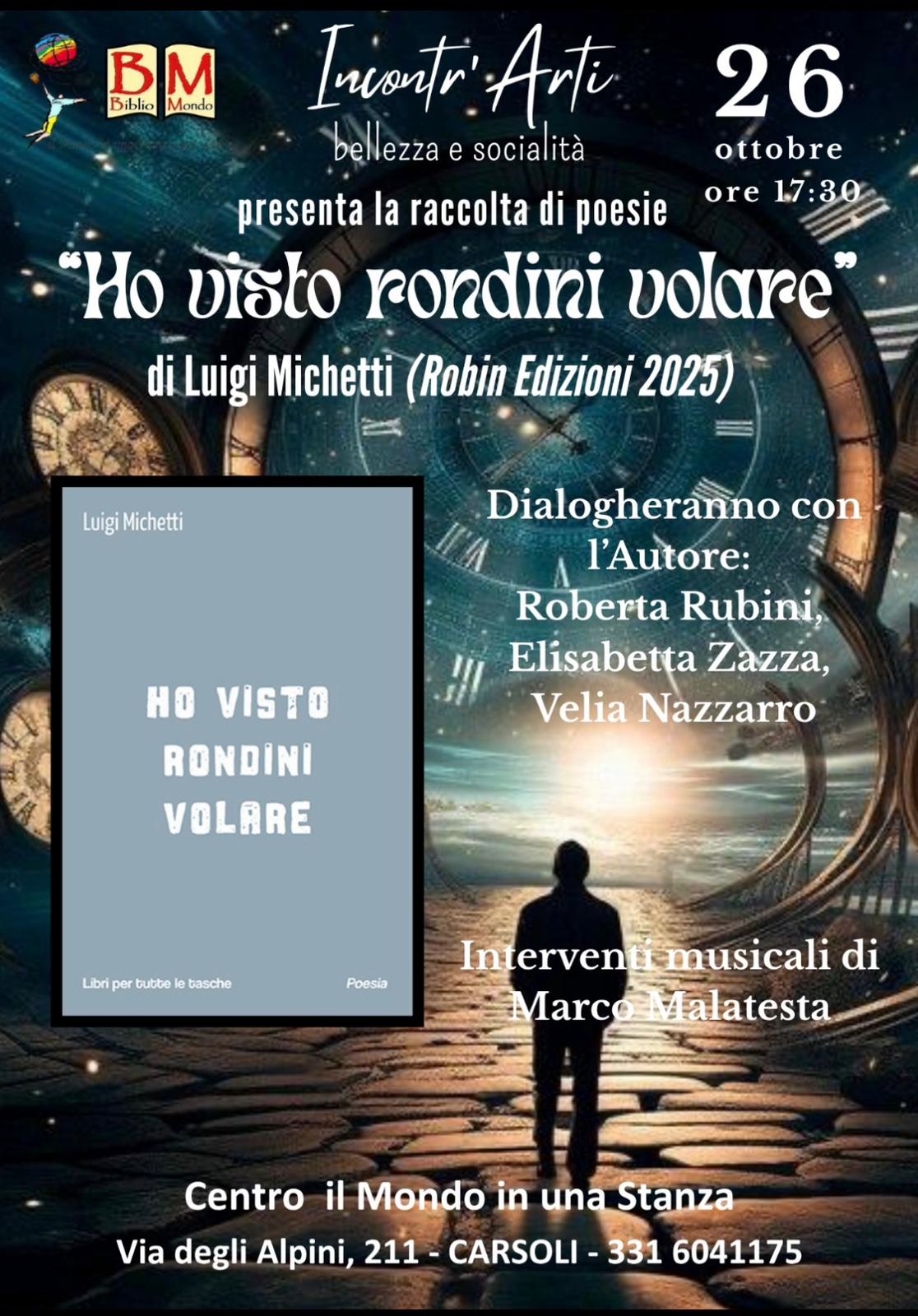 Carsoli – Domenica 26 ottobre alle ore 17:30 l’Associazione “Il mondo in una stanza di Farnaz Mirzapoor”, di Giancarlo Schiavoni ospiterà la presentazione del libro “Ho visto rondini volare” (Robin Edizioni, 2025) di Luigi Michetti.