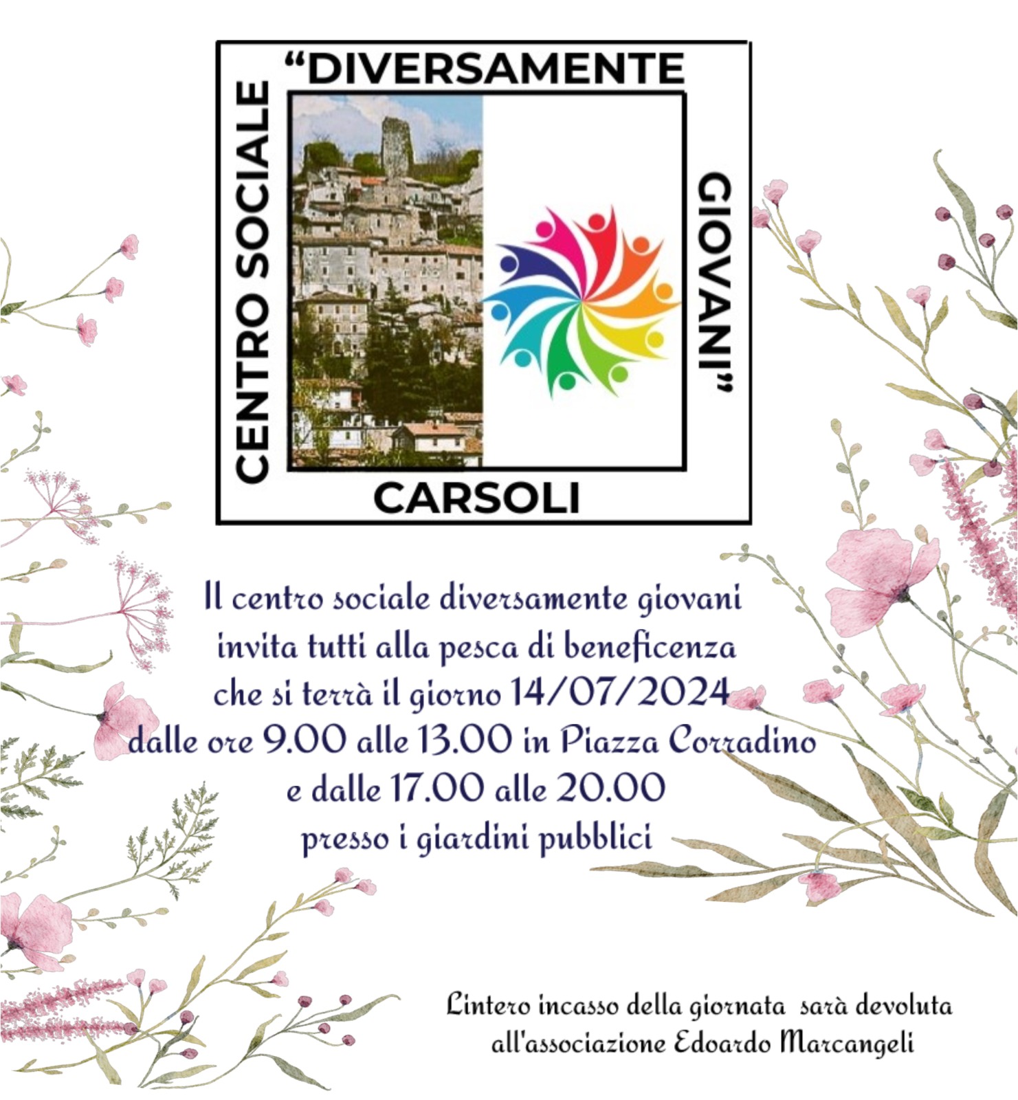 CARSOLI – Il Centro sociale “Diversamente giovani” ha organizzato per Domenica 14 Luglio una festa di beneficenza per scopi solidali. La mattina – spiega il presidente Mario Savoia – saremo in Piazza Corradino e nel pomeriggio presso i giardini pubblici con uno stand ove è allestita la pesca. Il ricavato sarà devoluto alla associazione Edoardo Marcangeli di Carsoli. Tutti sono invitati a partecipare”.