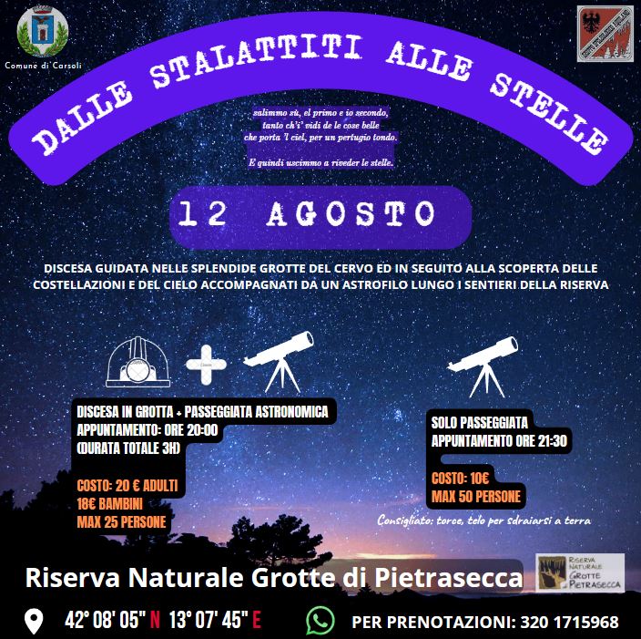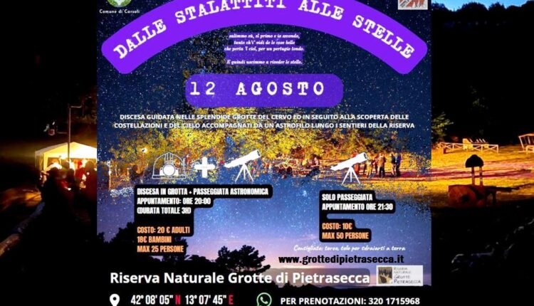 CARSOLI – Appuntamento speciale alla Riserva Naturale Speciale Grotte di Pietrasecca. Save the date: Sabato sera 12 agosto 2023. Nella suggestiva cornice della Riserva organizzato un evento unico nel suo genere: “Dalle stalattiti alle stelle”. Si tratta di una discesa guidata nelle spettacolari grotte del cervo, al quale farà seguito una osservazione astronomica delle costellazioni e del cielo con un esperto di astrologia. Si percorreranno in lungo e largo i sentieri della riserva apprezzando sfumature naturali uniche in un connubio perfetto tra cielo e terra. Di seguito tutte le informazioni per partecipare: