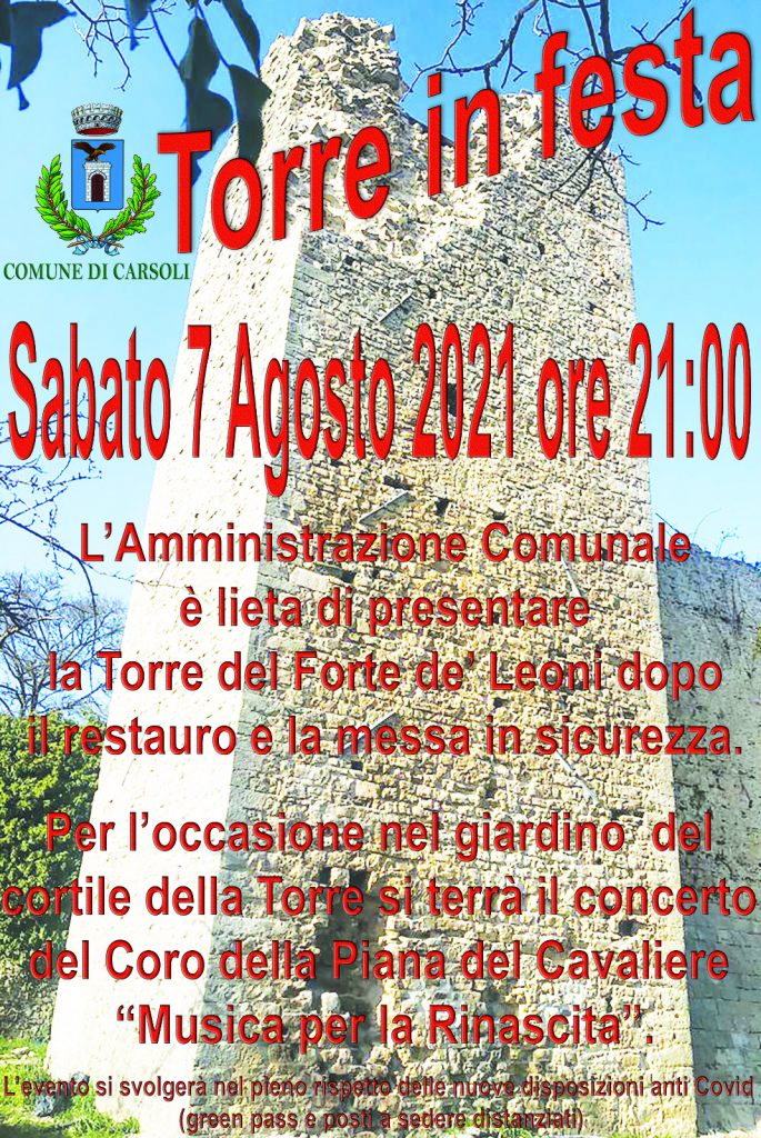 Carsoli – Serata d’eccellenza nella suggestiva cornice della restaurata antica “Fortezza”, ossia la torre del Forte De Leoni, che ospiterà un entusiasmante concerto la musica del coro polifonico “Piana del Cavaliere”. L’appuntamento è per domani sabato 7 agosto 2021 alle ore 21.00. Con l’occasione  verrà presentata dall’amministrazione comunale il completamento del restauro di uno dei luoghi di interesse storico culturale più importanti del territorio. Saranno 120 i posti a sedere, opportunamente distanziati. L’evento si svolgerà nel rispetto delle normative anticovid.