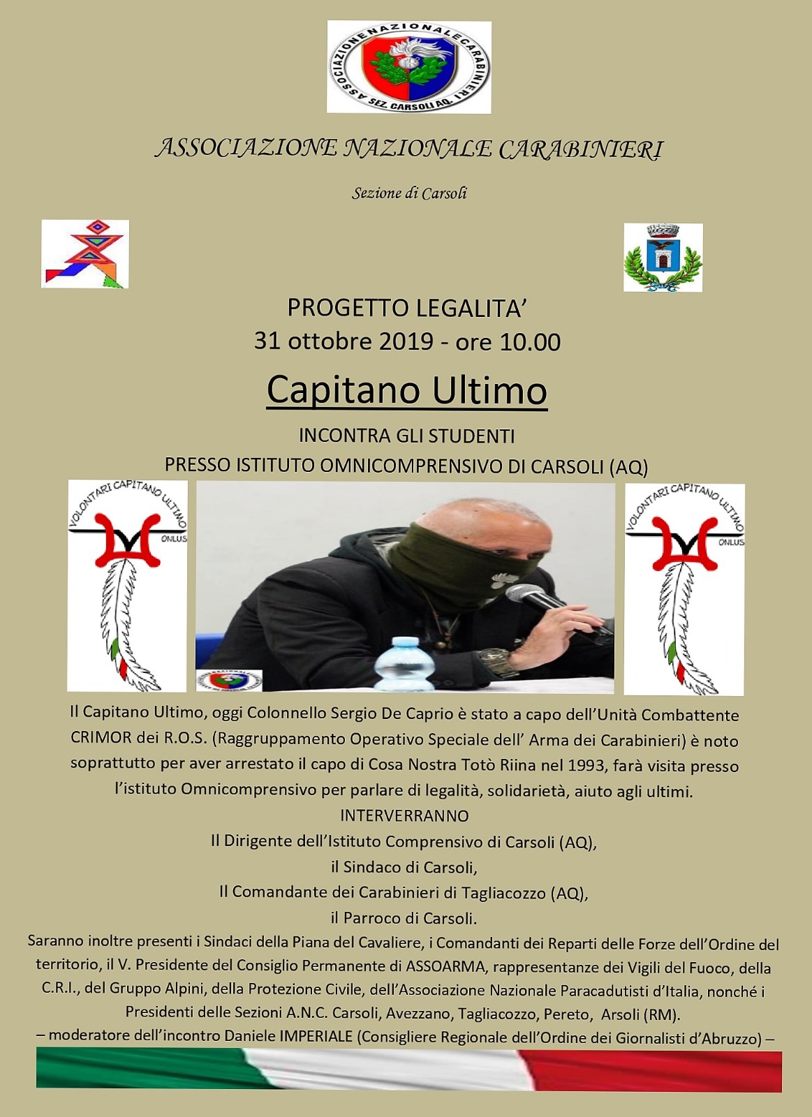 Carsoli – L’associazione Nazionale Carabinieri di Carsoli presieduta da Domenico Gregori, prosegue la propria mission con il Progetto Legalità, ed ha organizzato un interessante incontro presso l’Aula magna dell’Istituto Omnicomprensivo di Carsoli. L’appuntamento è per giovedì 31 ottobre dalle ore 10.00 con l’incontro aperto degli studenti dell’Istituto Omnicomprensivo Statale di Carsoli con Capitano Ultimo.