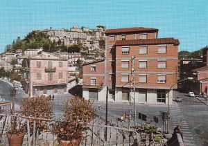 Carsoli – Dopo la guerra, ci vollero diversi anni  affinchè la realtà di Carsoli uscisse dal periodo nero della totale distruzione. Lo Stato ebbe ad erogare forme di finanziamento (i mutui per la ricostruzione da danni di guerra) per cui alcuni edifici vennero ricostruiti al posto di quelli storici. Nella piazza Guglielmo Marconi, la nuova costruzione moderna ed in cortina sostituì il Palazzo Baronale degli Angelini, distrutto dai bombardamenti. Lo scatto d’epoca è sulla piazza Marconi.  Era l’epoca della ripresa per la Città di Carsoli. L’immagine/cartolina venne scattata dal balcone dell’abitazione del compianto Gino De Luca detto Marconi,  che ebbe apportare alla città i primi segnali per la ricezione dei programmi televisivi della Rai e successivamente anche la GBR di Roma in epoche più recenti.  Da notare nello scatto  la FARMACIA del compianto dottor Augusto Petrocchi, illustre carsolano doc, che si trovava al piano terra del riedificato Palazzo Angelini. I nuovi ed amplissimi locali diedero lustro alla Città di Carsoli per una struttura farmaceutica all’avanguardia, che in precedenza era situata in un locale al piano terreno nel Palazzo Venditti (costruzione rimasta intatta dal 1910 ad angolo con la Piazzetta dell’edicola). Sulla sinistra al piano terreno del Palazzo Lattanzio, si può notare in tre vetrine contigue il negozio di Confezioni omonimo dei compianti fratelli Gino, Mario e Silvio LATTANZIO, punto di riferimento per tutto il comprensorio zonale. Anche l’Ufficio Postale era stato appena ultimato, con una moderna sede, sempre rivestita in cortina in linea con il Palazzo Angelini/Petrocchi. A sinistra dell’immagine si può osservare come per la conduzione della corrente elettrica si utilizzavano ancora i pali in legno ed un traliccio piuttosto ingombrante era presente proprio sullo slargo di Piazza Marconi. Vi rimase per moltissimo tempo. Una grande innovazione furono le strisce pedonali, unico elemento che regolava la segnaletica sul fondo stradale che venne asfaltato ex novo.  A destra si nota come sul bordo del fiume Turano vi fosse  un muretto di contenimento, anche basso, ove gli anziani dell’epoca erano soliti sedersi osservando i passanti come tradizione vuole.