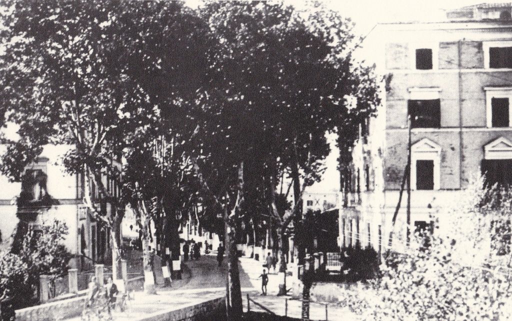 Quest’altro scatto è relativo al punto inverso rispetto all’altra foto, ed è relativo alla intersezione di via Roma con il”ponte de Dumitilla”, Lo stile imponente ed autorevole delle costruzioni private fu ispirazione progettuale anche per la ricostruzione. Questi due palazzi non vennero distrutti dai bombardamenti. Solo nel 1949 infatti venne redatto e predisposto uno specifico piano di ricostruzione epoca postbellica, redatto dagli ingg. Luigi Staroccia, Giuseppe Caretti, e dall’ Arch. Ugo Ferrante. Il 31 Marzo 1949 venne presentato alla Municipalità.