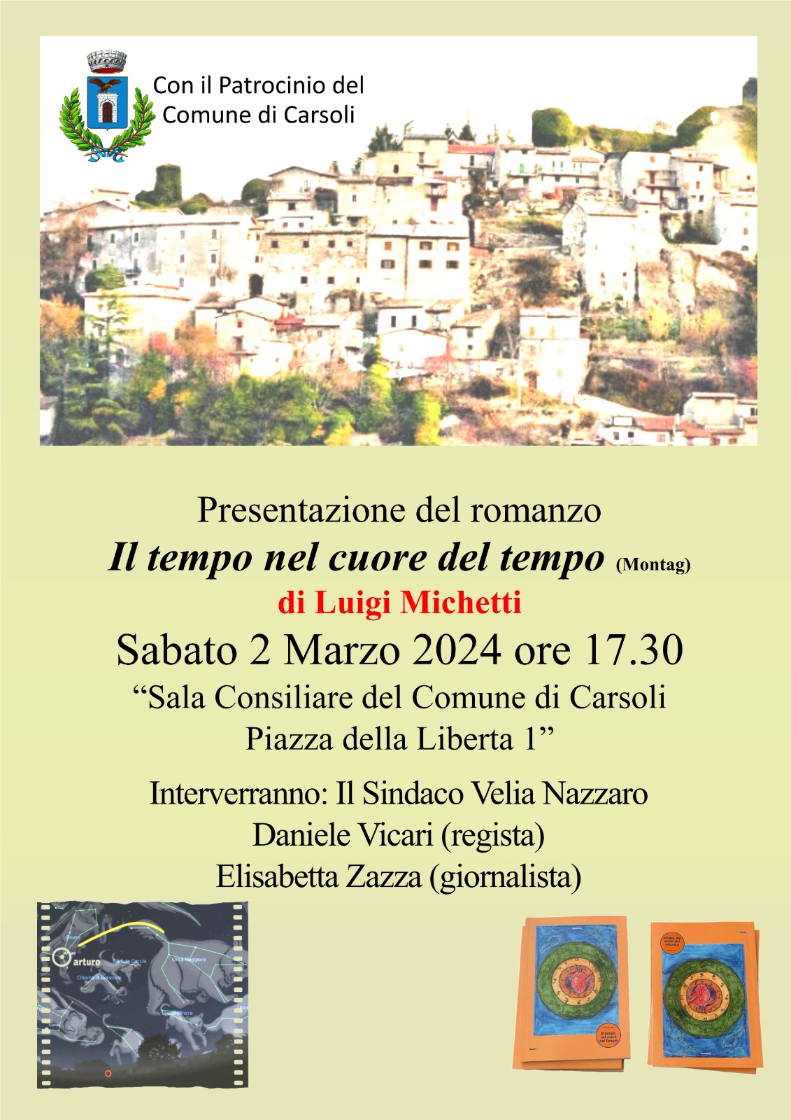 Carsoli – Un nuovo appuntamento con la cultura e la narrativa è atteso sabato 2 marzo alle ore 17:30 presso la Sala Consiliare del Comune di Carsoli, dove verrà presentato il romanzo “Il tempo nel cuore del tempo” (edizioni Montag) dello scrittore Luigi Michetti. Insieme all’autore interverranno il Sindaco Velia Nazzarro, il regista Daniele Vicari e la giornalista Elisabetta Zazza.