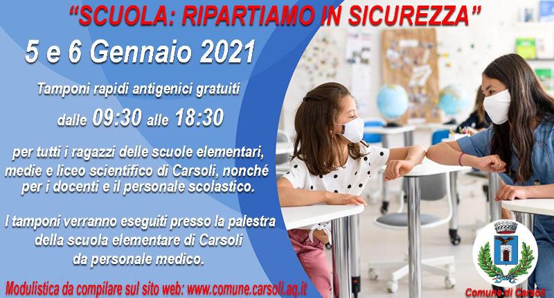 Carsoli – Sono stati organizzati dall’Amministrazione comunale due giorni di screening gratuiti anticovid (test rapido) per i giorni 5 e 6 gennaio 2021 con la collaborazione della Protezione Civile. Il servizio è rivolto a tutti gli studenti delle scuole elementari, medie, liceo scientifico del plesso di Carsoli, nonchè al personale ausiliario e docente.