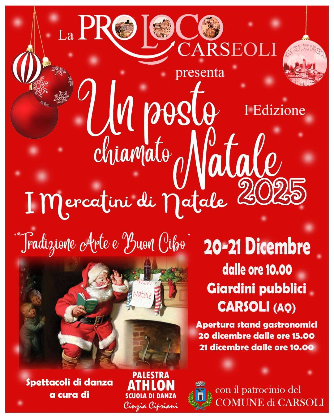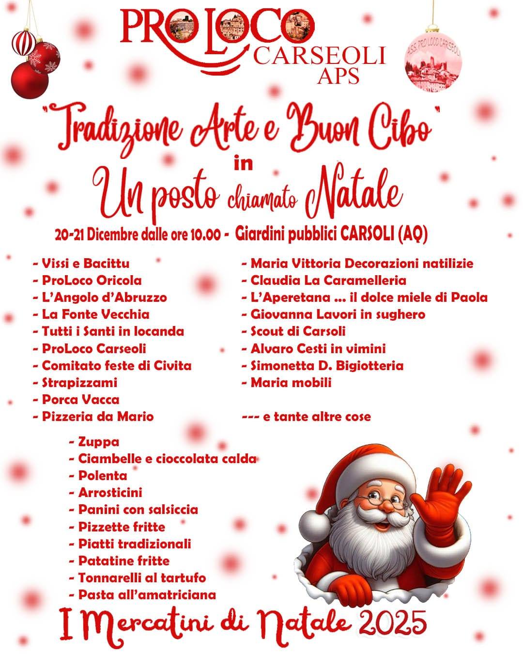 Carsoli si prepara a vivere un fine settimana all’insegna dell’atmosfera natalizia, della tradizione e della convivialità. Sabato 20 e domenica 21 dicembre, a partire dalle ore 10.00, i giardini pubblici del paese ospiteranno “Tradizione, Arte e Buon Cibo in un posto chiamato Natale”, l’evento promosso dalla Pro Loco Carseoli APS nell’ambito dei Mercatini di Natale 2025.