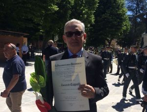 L’Aquila – Grande emozione questa mattina all’Aquila. Con decreto del presidente della repubblica del 2 giugno 2017, il Dott. Tancredi Cappelli nostro concittadino è stato insignito della Onoreficenza di Cavaliere dell’ordine al Merito della Repubblica Italiana. Alla consegna della distinzione onorifica ha proceduto personalmente il Prefetto dell’Aquila, Giuseppe Linardi, nell’ambito della cerimonia ufficiale per il 72° anniversario della Proclamazione della Repubblica che si è svolta questa mattina presso il Piazzale del Monumento ai caduti nella Villa Comunale dell’Aquila. Al cerimoniale ha presenziato anche il Sindaco di Carsoli Velia Nazzarro che oltre a rappresentare il Comune alla ricorrenza aquilana è stata testimonial della comunità al fianco dell’insignito dott. Cappelli per questo importante traguardo raggiunto. “E’ stata una mattinata emozionante – ha affermato il primo cittadino di Carsoli, sia per la festa della Repubblica ma soprattutto per aver condiviso e rappresentato la comunità all’avvenuta consegna dell’onoreficenza al dott. Tancredi Cappelli, stimato concittadino nonchè da anni in servizio presso la Prefettura Aquilana. Mi auguro – ha concluso il Sindaco – che questa testimonianza serva a riaffermare, oggi più che mai i valori propri delle istituzioni, nelle quali ci sono uomini di grande valore”.