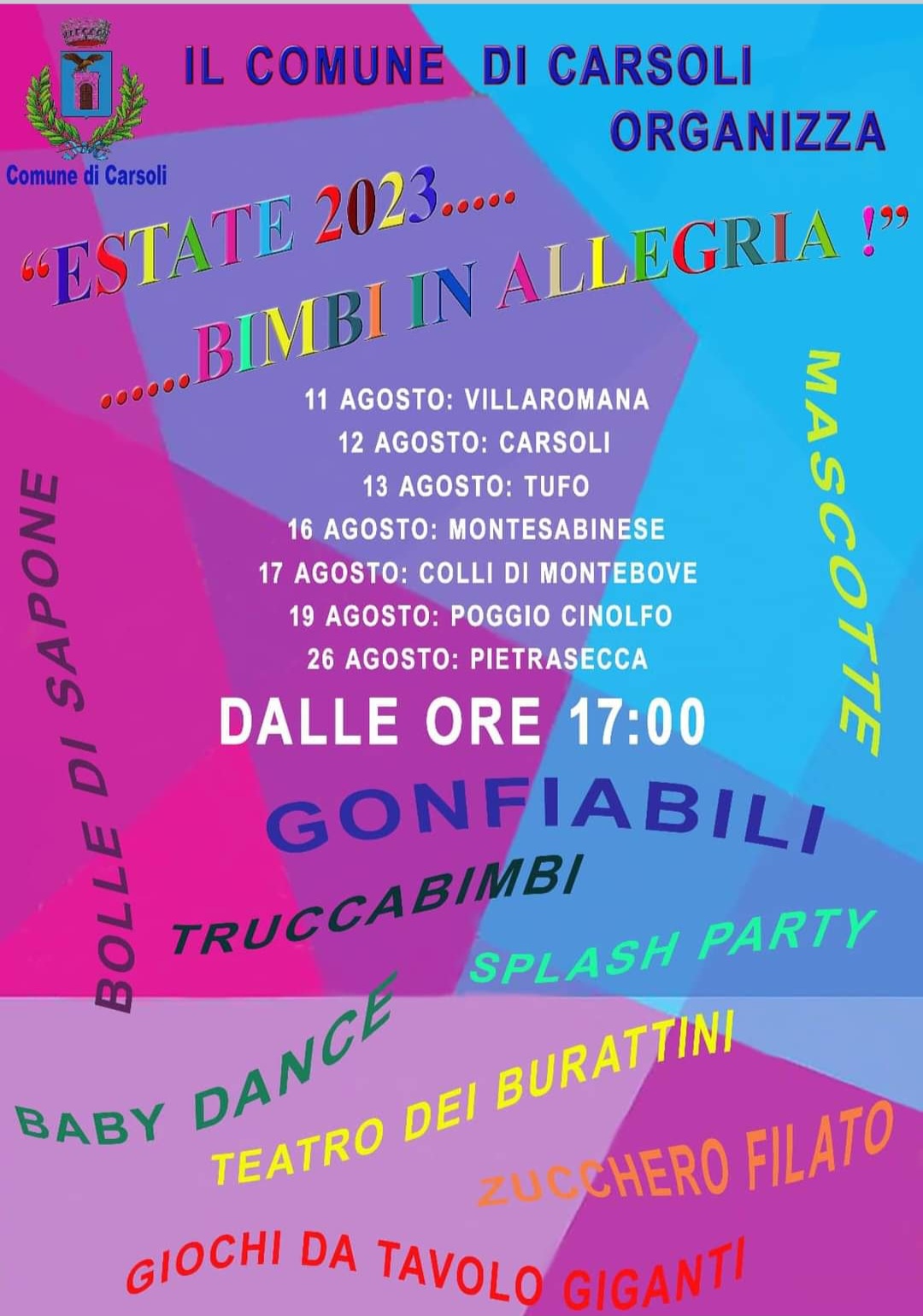 CARSOLI – Da oggi si inizia a Villaromana poi il tour di gonfiabili per il divertimento dei piu’ piccoli prosegue a Carsoli e secondo il calendario nel dettaglio evento di seguito pubblicato: