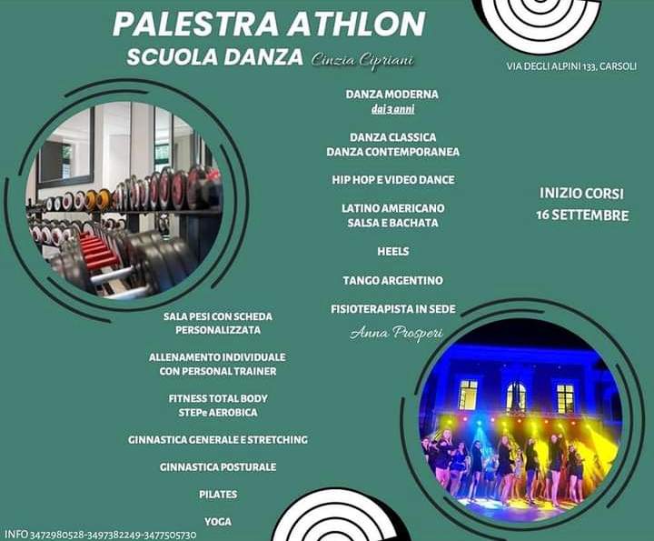 Dal 16 settembre pronti per nuovi corsi nella sede della storica palestra Athlon, nella quale,come sempre, sarà possibile accedere alla sala pesi, richiedere l’intervento di un personal trainer o del fisoterapista presente in sede, Anna Prosperi.