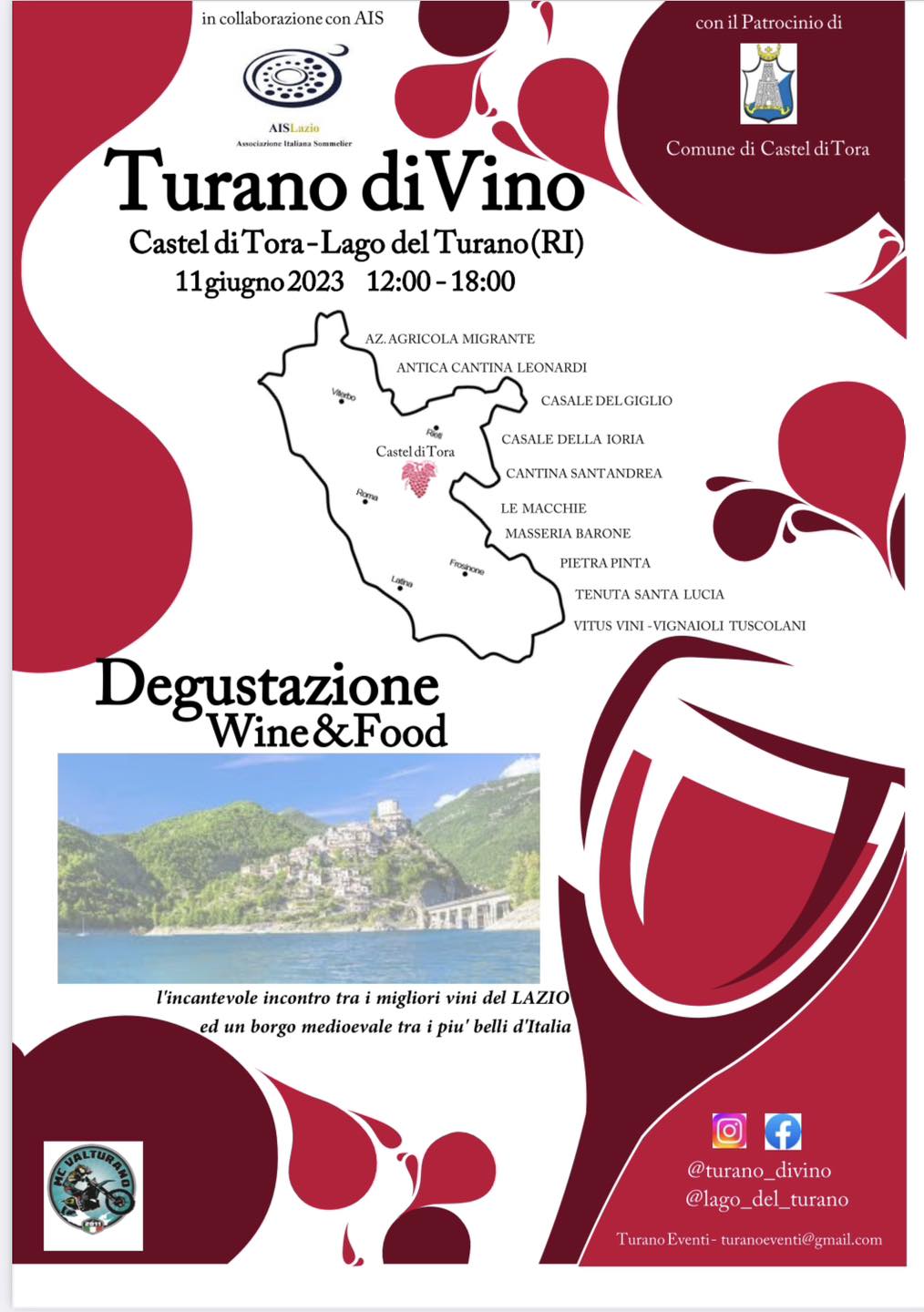 Castel di Tora – Nello splendido scenario del lago del Turano, tra le vie del borgo medioevale di Castel di Tora si terrà l’11 giugno 2023, dalle ore 12 alle ore 18, la manifestazione “Turano diVino”, un evento incentrato sulla conoscenza del vino e del buon bere, alla scoperta della cultura enogastronomica.