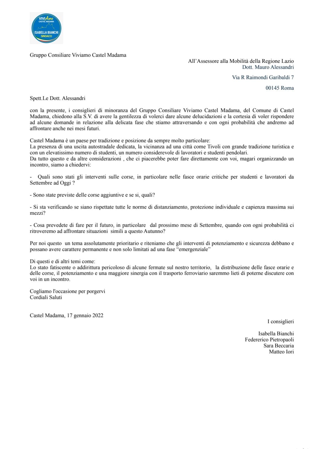 Castel Madama – Troppe cose non funzionano, tante aspettative nel trasporto pubblico locale che sono state rese vane. Il gruppo consiliare Viviamo Castel Madama, ha preso carta e penna ed ha scritto all’assessore della regione Lazio Mauro Alessandri delegato alla mobilità. La nota, energica e che viene allegata di seguito attende risposte.