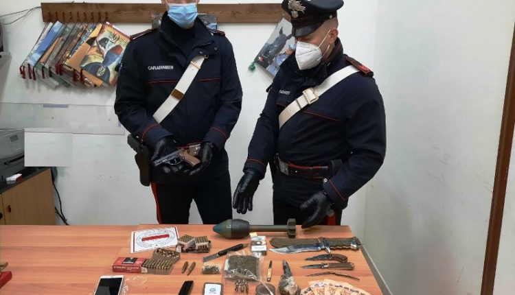 Le operazioni di perquisizione sono proseguite in modo capillare all’interno dell’appartamento e hanno permesso anche di rinvenire, occultati nel doppiofondo di un forno elettrico in disuso, una pistola Beretta cal. 7,65 con caricatore inserito e 12 munizioni, pronta a sparare e con matricola abrasa, diversi coltelli di detenzione illecita, ben 130 munizioni cal. 7,65 e addirittura una bomba da esercitazione in uso all’Esercito Italiano, depotenziata ma comunque letale.