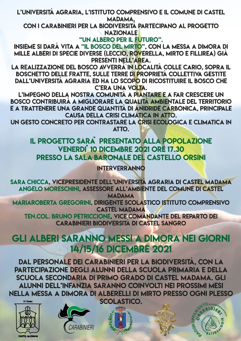 Castel Madama. Il Comune di Castel Madama, l’Università Agraria, l’Istituto Comprensivo e i Carabinieri per la Biodiversità partecipano al progetto nazionale “Un albero per il futuro” promosso dal Ministero della Transizione Ecologica. Verrà realizzato il “Bosco del Mirto” nel territorio dell’Università Agraria, il bosco diffuso più grande d’Italia con la messa a dimora di 1000 piante di specie autoctone. I nostri bambini saranno protagonisti insieme ai Carabinieri per la Biodiversità della piantumazione delle prime piante. Saranno poi organizzate delle giornate in cui ogni singolo o famiglia potrà piantare il proprio albero. Di seguito il dettaglio degli eventi: