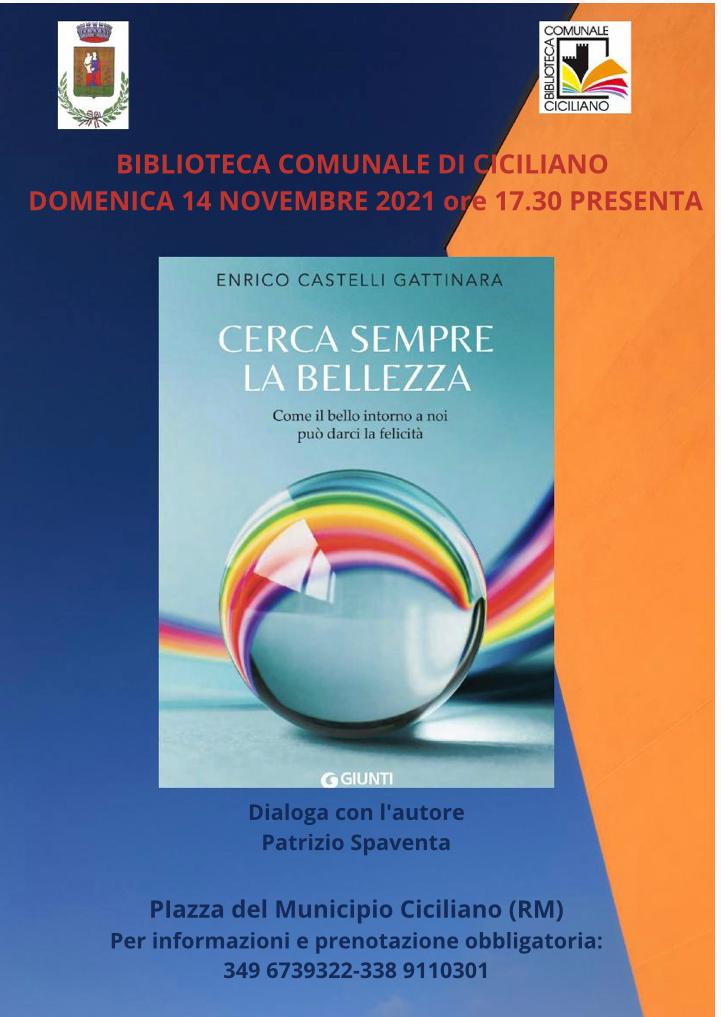 Ciciliano – “La bellezza salverà il mondo”, diceva il principe Myškin, protagonista del romanzo “L’idiota” di  Fëdor Dostoevskij. E proprio di bellezza si parlerà domenica 14 novembre alle ore 17:30 a Ciciliano, grazie a una nuova iniziativa culturale organizzata dalla Biblioteca comunale, che ospiterà Enrico Castelli Gattinara per presentare il suo ultimo libro “Cerca sempre la bellezza”. Dialoga con l’autore Patrizio Spaventa.