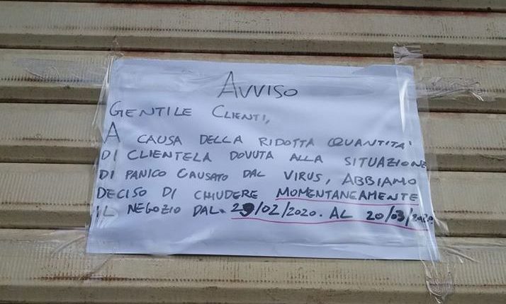 “A causa della ridotta quantità di clientela dovuta alla situazione di panico causato dal virus abbiamo deciso di chiudere momentaneamente il negio dal 29 febbraio 2020 al 20 Marzo 2020”.