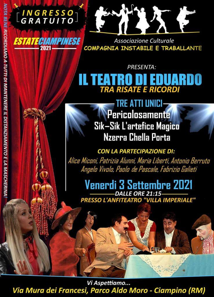 Ciampino – Tanta voglia di ridere insieme, il 3 settembre, a Ciampino, presso la cavea del parco Aldo Moro, alle ore 21:15. La Compagnia Instabile e Traballante presenta “Il teatro di Eduardo”: tre atti unici con la partecipazione di Alice Miconi, Patrizia Alunni, Maria Liberti, Antonio Berruto, Angelo Vivolo, Paolo de Pascale, Fabrizio Galieti.
