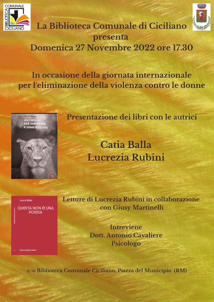 Ciciliano – La Biblioteca comunale di Ciciliano prosegue con grande entusiasmo gli eventi della stagione autunnale. Domenica 27 novembre alle ore 17.30 appuntamento con le autrici Catia Balla e Lucrezia Rubini per presentare i loro libri in occasione della Giornata mondiale per l’eliminazione della violenza contro le donne. Interverrà anche lo psicologo Dott. Antonio Cavaliere. Tutta la comunità è invitata a partecipare.