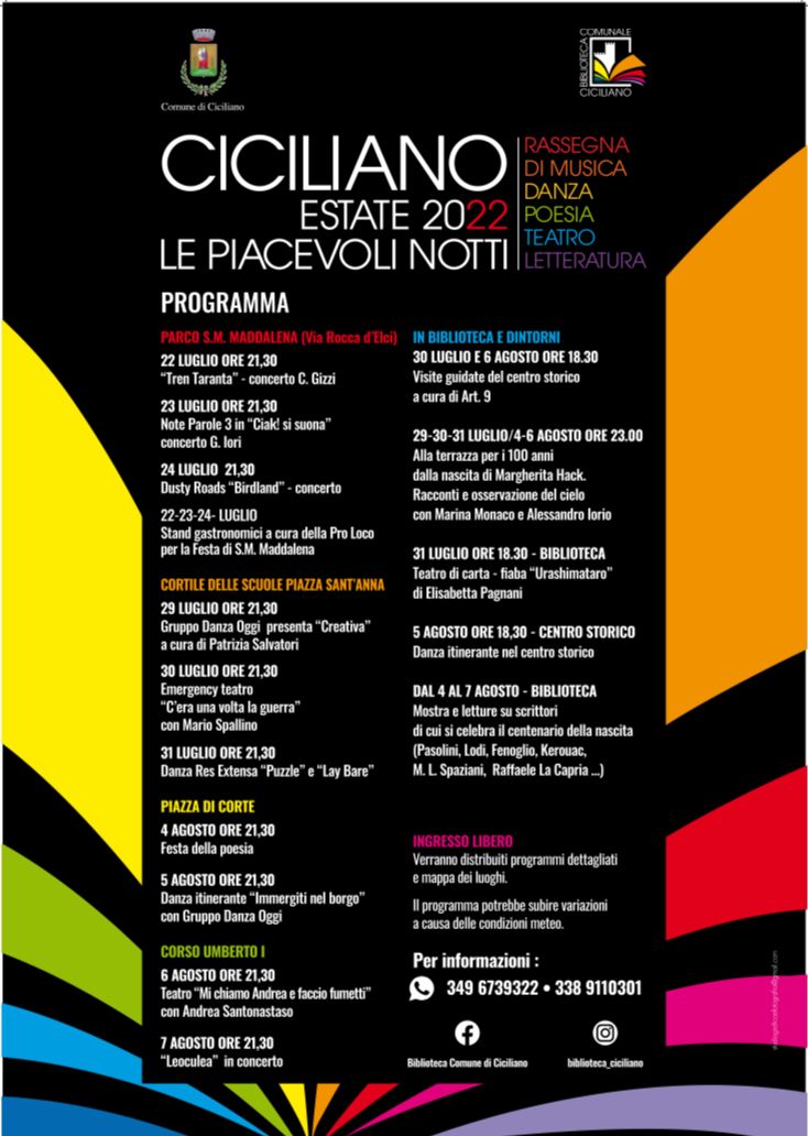 Ciciliano – Un’altra estate in compagnia di grandi eventi nel bellissimo borgo di Ciciliano, alle porte di Roma, con la terza edizione de “Le piacevoli notti”, a partire dal 22 luglio. Grazie all’iniziativa dell’instancabile Biblioteca comunale di Ciciliano, con il supporto del sindaco Massimiliano Calore e la collaborazione con le tante realtà territoriali, un altro anno si arricchisce di interessanti appuntamenti culturali e artistici per allietare le sere d’estate di cittadini e turisti di tutte le età, adulti, giovani e bambini. C’è grande attesa e fermento per questa terza edizione, che conferma l’impegno costante e appassionato dei volontari della Biblioteca, da sempre impegnati nel trasmettere i valori della Cultura e della Bellezza.