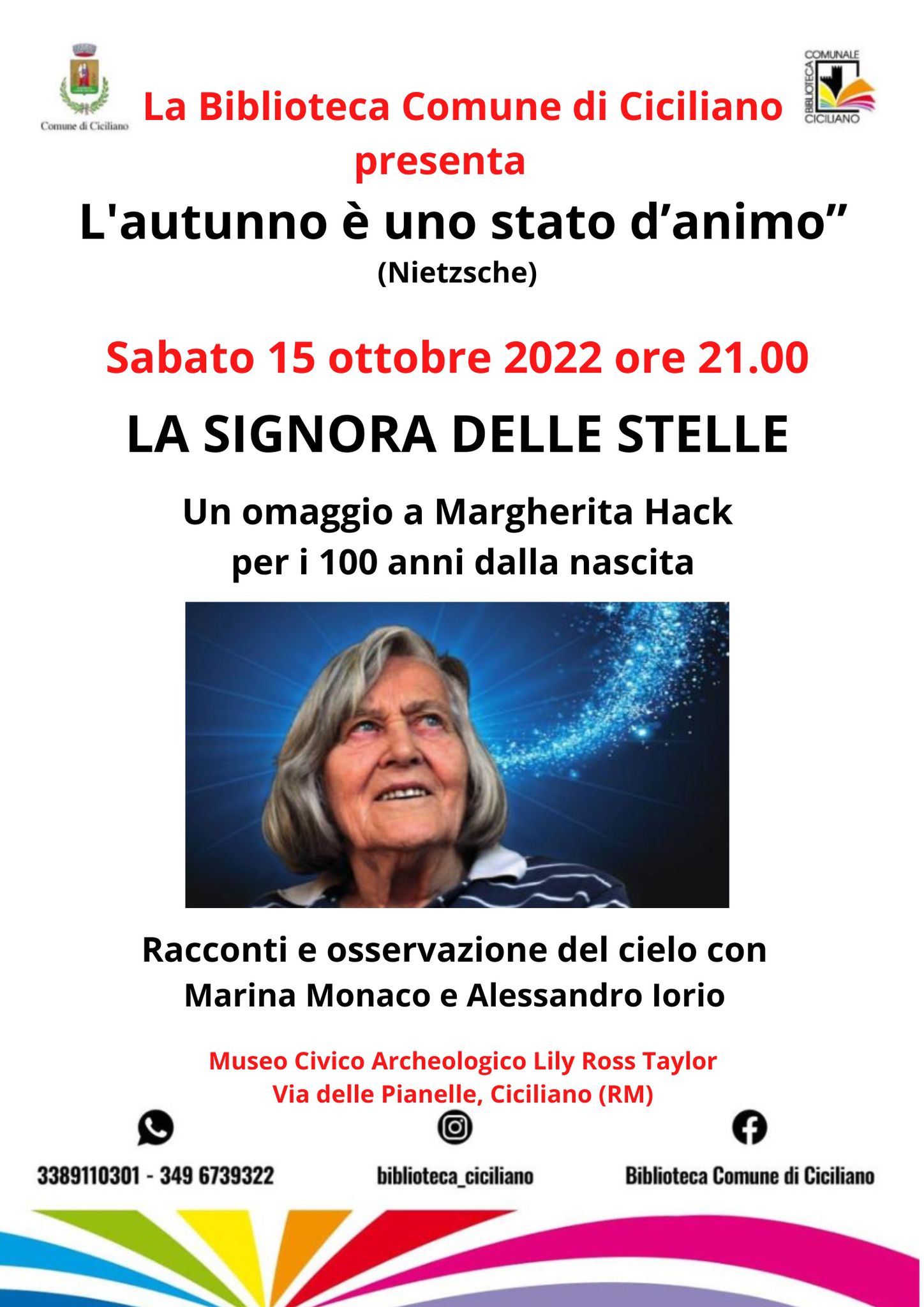 Ciciliano – Comincia in grande stile la stagione autunnale a Ciciliano, con la serie di incontri che animeranno il pubblico e faranno compagnia fino a dicembre. “L’autunno è uno stato d’animo”: è con le parole di Nietzsche che la Biblioteca comunale di Ciciliano dà il via alla terza edizione di incontri letterari e artistici. Il primo appuntamento è un omaggio alla grande astronoma Margherita Hack, sabato 15 ottobre alle ore 21 al Museo civico archeologico Lily Ross Taylor, in via delle Pianelle, a Ciciliano.