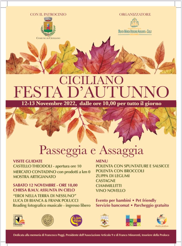 Ciciliano – Arriva la Festa d’Autunno nel piccolo e affascinante borgo di Ciciliano. Sabato 12 e domenica 13 novembre attendono il pubblico due splendide giornate per le piazze e i vicoli di Ciciliano: visite guidate al Castello Theodoli e nel centro storico, mostre artigianato, mercato contadino e proposte culinarie e la Biblioteca di Ciciliano darà il suo contributo rimanendo aperta anche in quei giorni. E non è tutto, perché presenterà anche lo spettacolo “Eroi nella terra di nessuno”, di e con Luca Di Bianca e Frank Paolucci.