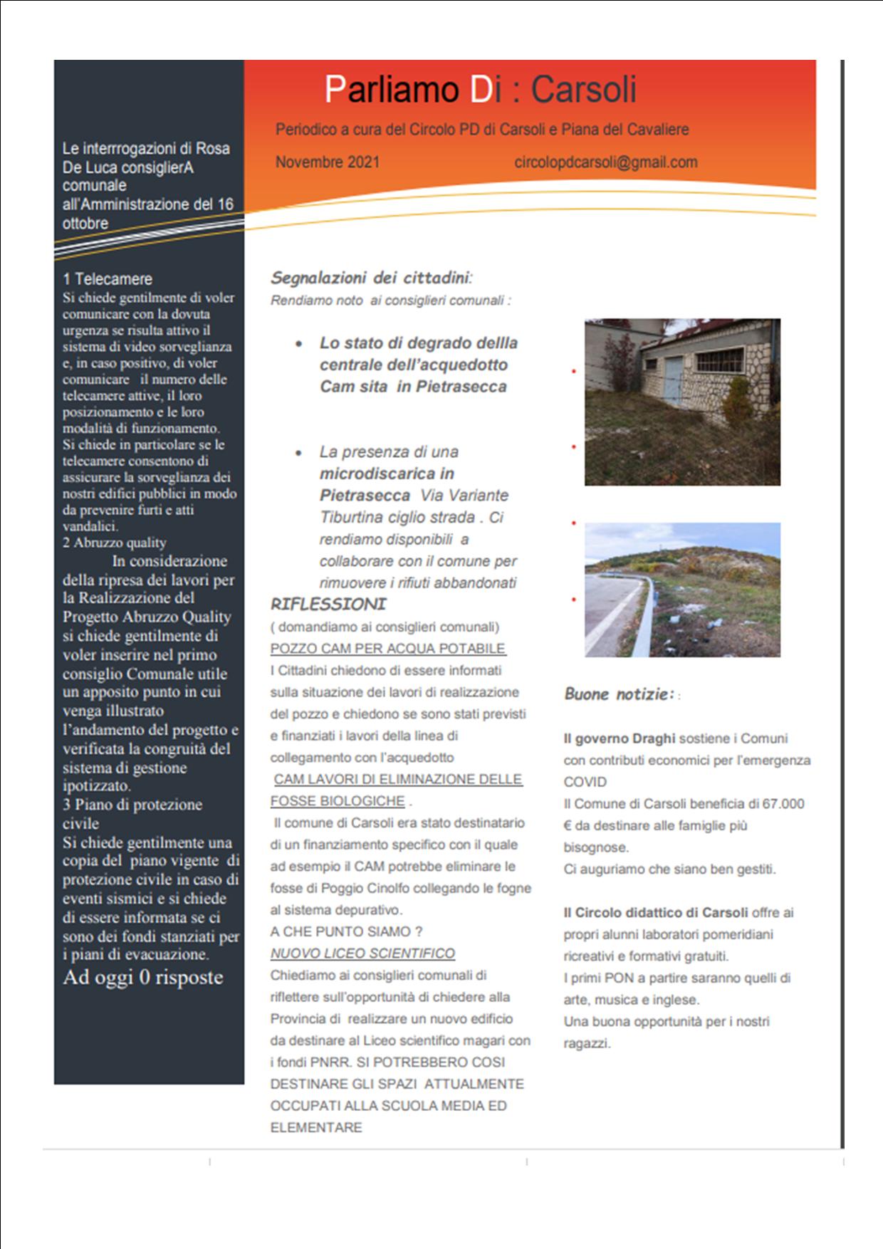 Carsoli – Di seguito in allegato Jpg e Pdf il periodico realizzato a cura del Circolo del Partito Democratico di Carsoli e Piana del Cavaliere: