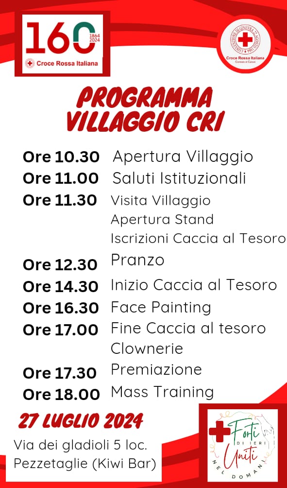 CIVITA DI ORICOLA – Alle ore 10.00 di domani 27 Luglio 2024, la Croce Rossa Italiana comitato di Carsoli organizza il “Villaggio Cri”, l’appuntamento è dalle ore 10.00 per un susseguirsi di eventi che caratterizzeranno l’intera giornata. Di seguito il programma!