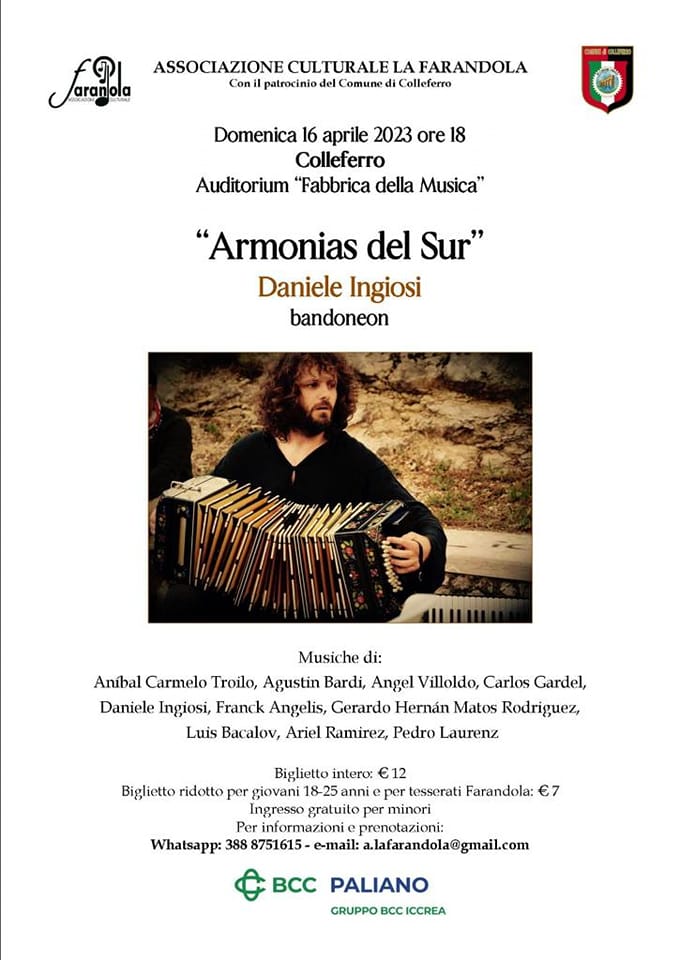 Colleferro – Domenica pomeriggio alle ore 18:00 presso l’Auditorium Fabbrica della Musica di Colleferro, Daniele Ingiosi con il suo bandoneon sarà protagonista di un intenso omaggio al Tango con il concerto “Armonias del Sur”.