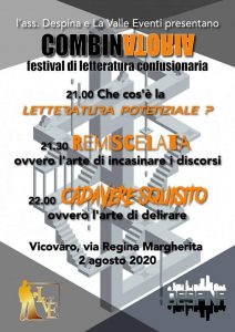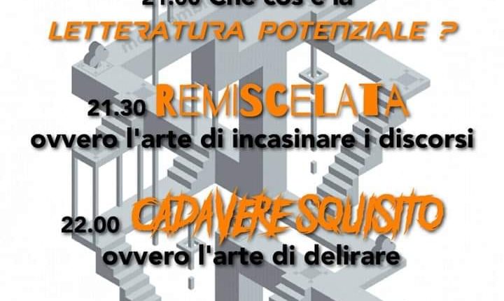 La prima parte dell’evento, che si terrà il 2 agosto alle 21:00 in Via Regina Margherita a Vicovaro (nei pressi di Piazza San Pietro) ed è organizzato in collaborazione con La Valle Eventi, sarà dedicata all’illustrazione del significato di “letteratura potenziale” (detta anche combinatoria, o strutturalista, con lievi differenze di significato): attraverso la lettura di brani di Calvino, Benni, Queneau e altri, si cercherà di valorizzare quel filone della letteratura che trova la propria forza nei testi intercambiabili, nei paradossi e giochi linguistici, nella metaletterarietà.