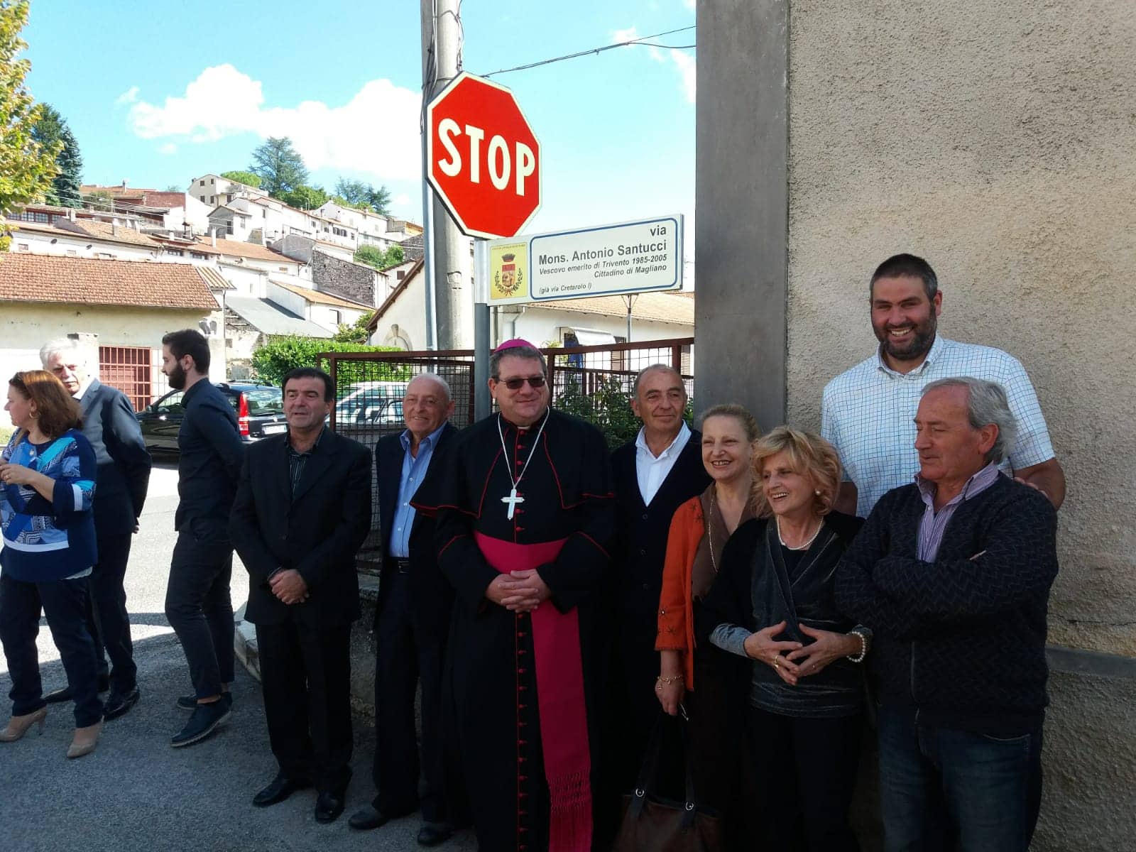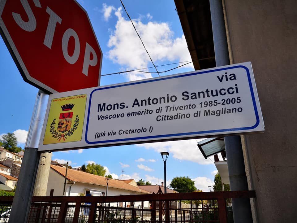 Magliano dei Marsi – Si è svolta questa mattina in un clima di grande commozione la cerimonia in onore di Mons. Antonio Santucci emerito Vescovo di Trivento, al quale la sua città natale Magliano dei Marsi ha voluto intitolare una strada cittadina. La targa è stata scoperta dal sindaco Avv. Mariangela Amiconi, unitamente al Vescovo di Trivento Monsignor Claudio Palumbo. Presente anche una delegazione del Comune di Trivento e del Comune di Carsoli con l’assessore Alessandra Zazza e la Presidente del Consiglio Lorenza Muzi, dove Mons. Santucci fu parroco dal 1973 al 1985. Venne definito il “parroco della rinascita” perchè ebbe un ruolo importante e propulsivo che fu fondamentale per la città di Carsoli.