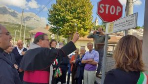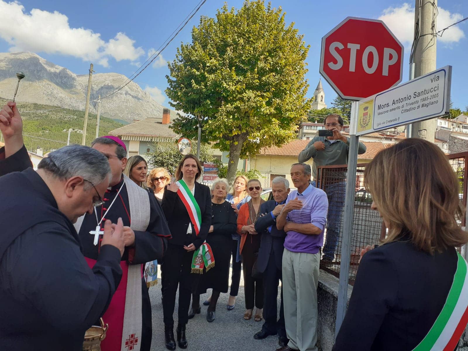 Magliano dei Marsi – Si è svolta questa mattina in un clima di grande commozione la cerimonia in onore di Mons. Antonio Santucci emerito Vescovo di Trivento, al quale la sua città natale Magliano dei Marsi ha voluto intitolare una strada cittadina. La targa è stata scoperta dal sindaco Avv. Mariangela Amiconi, unitamente al Vescovo di Trivento Monsignor Claudio Palumbo. Presente anche una delegazione del Comune di Trivento e del Comune di Carsoli con l’assessore Alessandra Zazza e la Presidente del Consiglio Lorenza Muzi, dove Mons. Santucci fu parroco dal 1973 al 1985. Venne definito il “parroco della rinascita” perchè ebbe un ruolo importante e propulsivo che fu fondamentale per la città di Carsoli.
