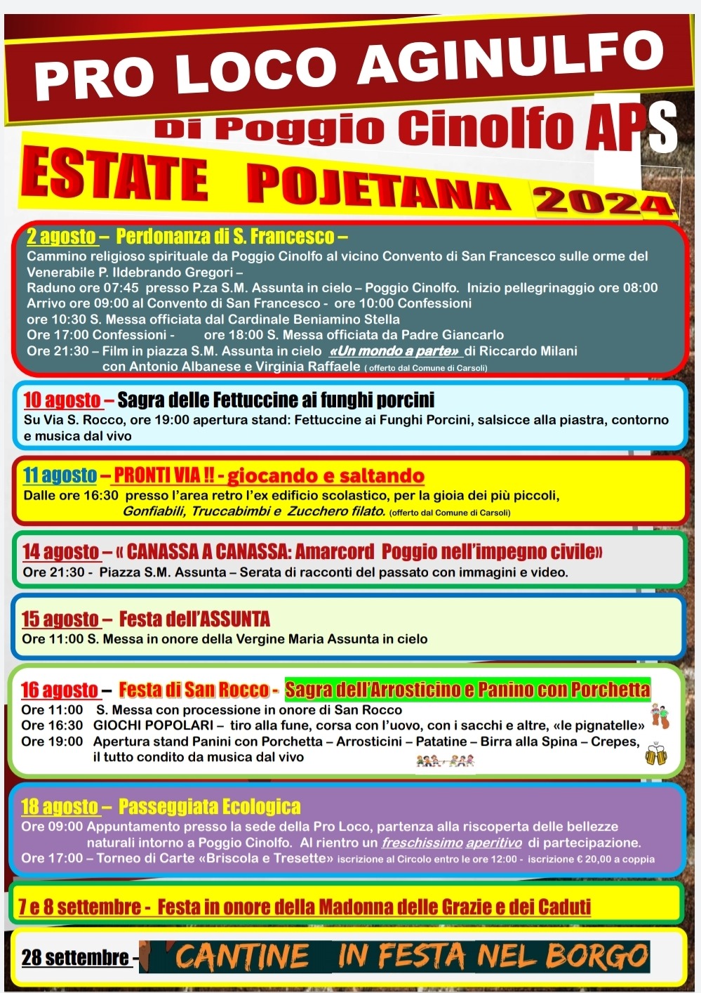 POGGIO CINOLFO  – Il primo appuntamento è per il 2 agosto 2024 con la perdonanza di San Francesco. Si parte da Poggio Cinolfo per raggiungere a piedi il convento di San Francesco ove si svolgerà una intera giornata all’insegna della ricreazione, fede e cultura. Si tratta di un evento che da il via ad una serie di inziative intraprese dalla Pro Loco Aginulfo. Di seguito il calendario eventi in sequenza: