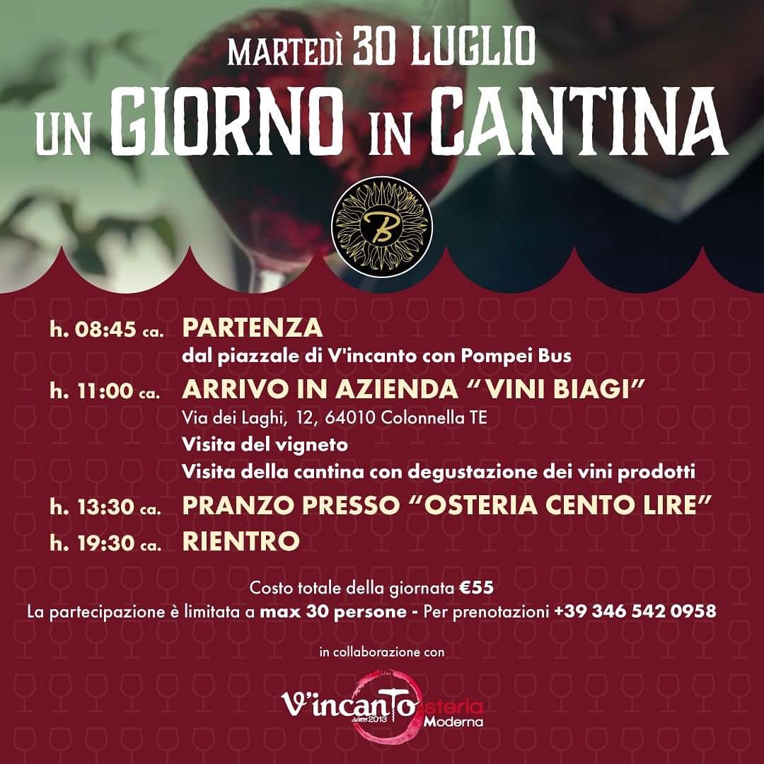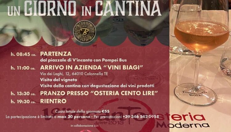 CARSOLI – L’appuntamento è per martedì 30 luglio 2024 per un tour dedicato agli appassionati del vino e della produzione diretta. Un giorno in cantina il format prevede la partenza dal piazzale V’Incanto, nei pressi dell’uscita A24 Carsoli Oricola, ed una visita guidata che avrà luogo presso l’azienda vitivinicola Biagi a Colonnella in provincia di Teramo. Occasione poi per una conviviale speciale. Il progetto V’Incantiamo, ha avuto inizio già nel 2018 con un crescente successo di partecipanti. Di seguito il programma dettagliato e le info per partecipare.