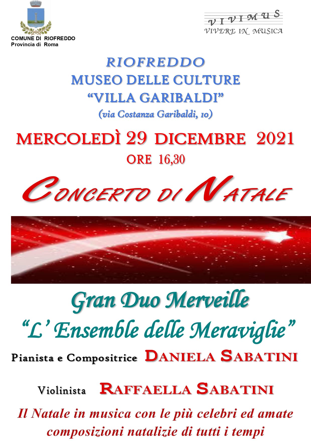 Riofreddo – Il Museo delle Culture Villa Garibaldi in collaborazione con il Comune di Riofreddo ha organizzato il Concerto di Natale il giorno mercoledì 29 Dicembre 2021 alle ore 16:30. Il Gran Duo Merveille delizierà con melodie e musiche natalizie. Lo rende noto il Museo delle culture in una nota social.