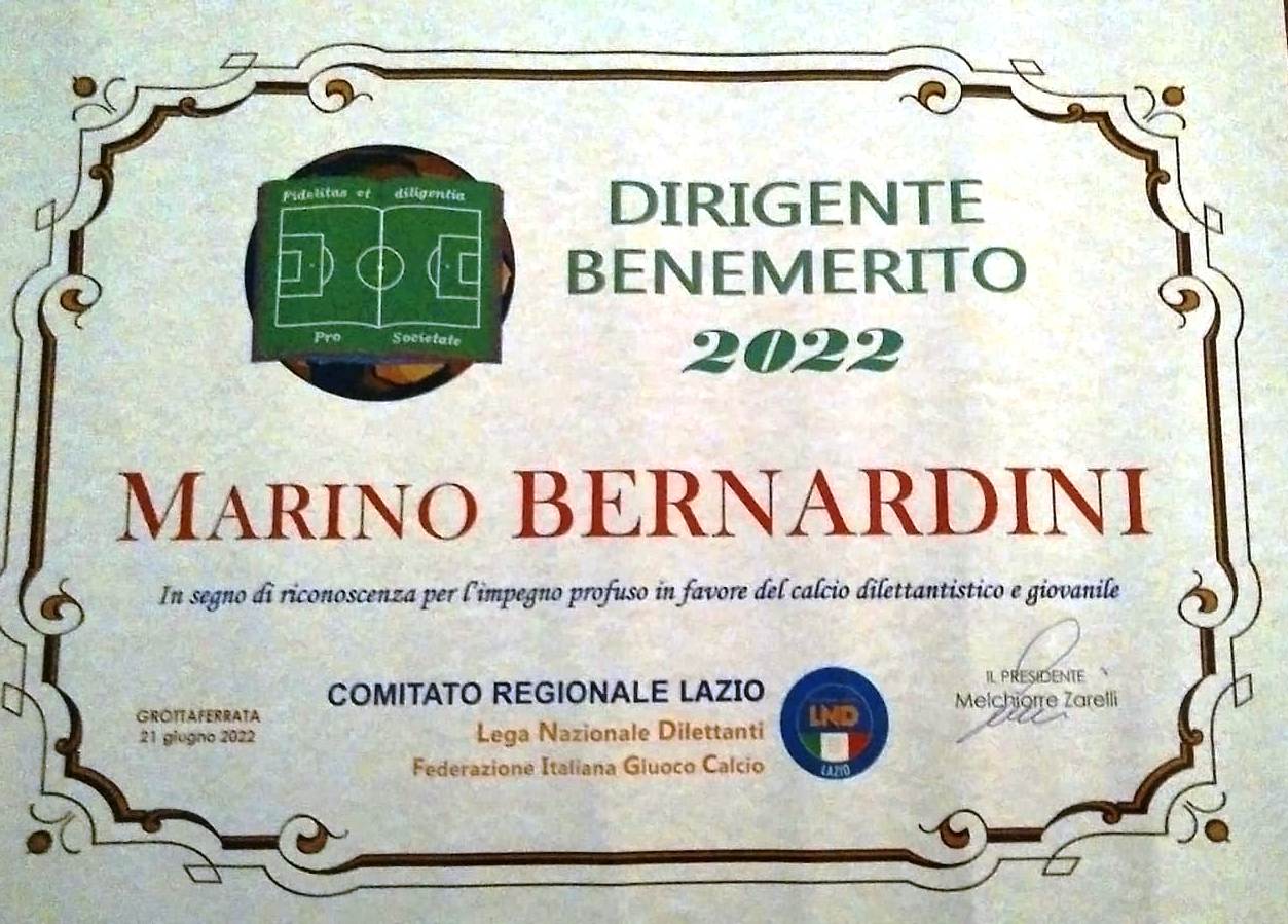 ROMA – Il vice presidente regionale C.R. Lazio della Federazione Italiana Giuoco del Calcio cav. Umberto Fusacchia, ha conferito al mister Marino Bernardini un riconoscimento speciale di benemerenza. L’iniziativa è stata intrapresa dalla Federerazione per riconoscere i meriti dell’attività svolta da Marino per 67 anni continuativi nel mondo dello sport calcistico.