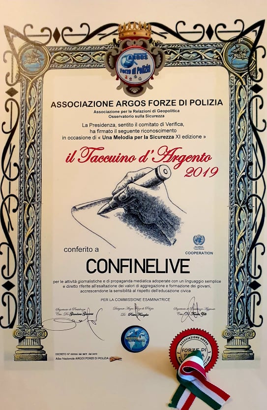 Avezzano – L’Associazione Argos delle Forze di Polizia ha conferito alla testata giornalistica “ConfineLive” il Taccuino d’argento 2019 con la seguente motivazione: “per le attività giornalistiche e di propaganda mediatica adoperate con linguaggio semplice e diretto alla esaltazione dei valori di aggregazione e formazione dei giovani”.