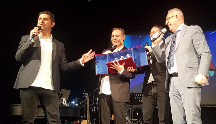 Guidonia Montecelio – Ieri sera il Sindaco Michel Barbet e Rosaria Morroi Assessore Cultura e Pubblica Istruzione Guidonia Montecelio hanno consegnato ai Gemelli di Guidonia una copia della Triade Capitolina e tre attestati di riconoscimento, come segno di gratitudine per aver portato grazie al loro successo alla ribalta nazionale il nome della Città. La premiazione è avvenuta a margine dello spettacolo “Tre X 2” tenutosi al Teatro Imperiale Guidonia Montecelio GMS Eventi, come anteprima nazionale del nuovo tour dei tre talentuosi fratelli Acciarino.