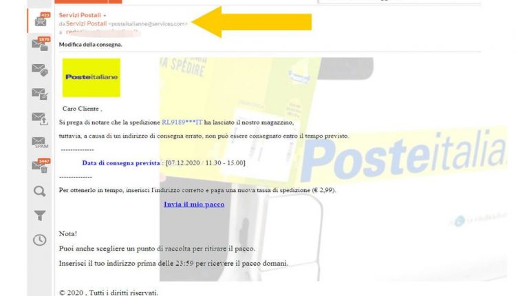 La mail proviene da: posteitalianne e non da Poste Italiane, identificativo scelto è Servizi Postali, oggetto: modifica della consegna. Nulla sembra essere distorto a primo avviso, lo stemma di Poste Italiane, ed un messaggio che annuncia una consegna. Di qui la richiesta di un pagamento di sole 2 euro e 99 centesimi. E chi per una somma cosi esigua vorrebbe rinunciare al suo pacco?