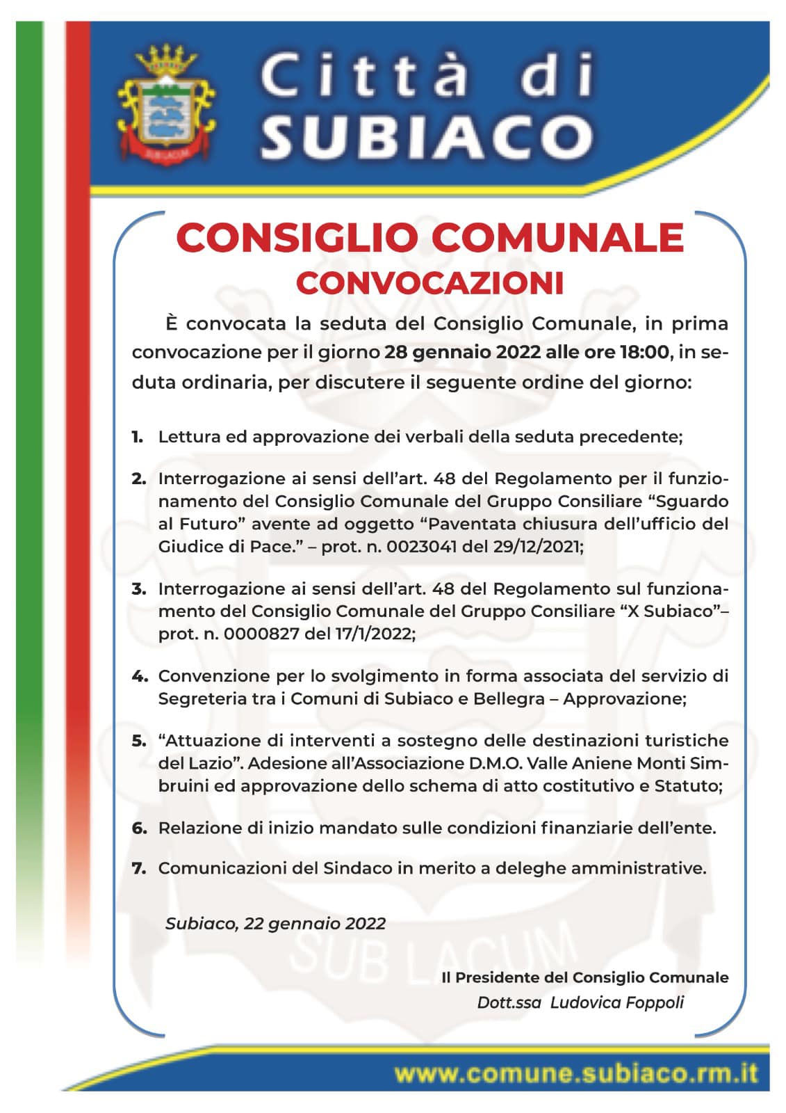 Subiaco – Con provvedimento del presidente del consiglio Ludovica Foppoli,  è stata convocata la seduta del Consiglio Comunale in prima convocazione per il giorno 28 Gennaio 2022 alle ore 18:00, per discutere il seguente ordine del giorno: