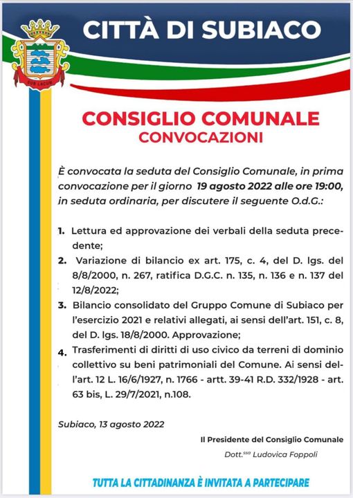 SUBIACO – È stata disposta la convocazione della seduta del Consiglio Comunale di Subiaco in prima convocazione per il giorno 19 agosto 2022 alle ore 19:00, in seduta ordinaria, per discutere il seguente ordine del giorno: