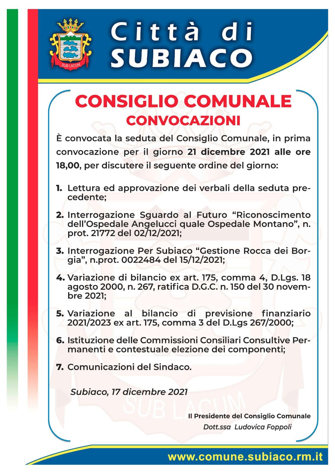 Subiaco – Il presidente del consiglio comunale dott.ssa Ludovica Foppoli con proprio provvedimento ha convocato il consiglio comunale di Subiaco per il giorno 21 dicembre 2021 alle ore18.00 per discutere su 7 punti all’ordine del giorno: di seguito il dettaglio