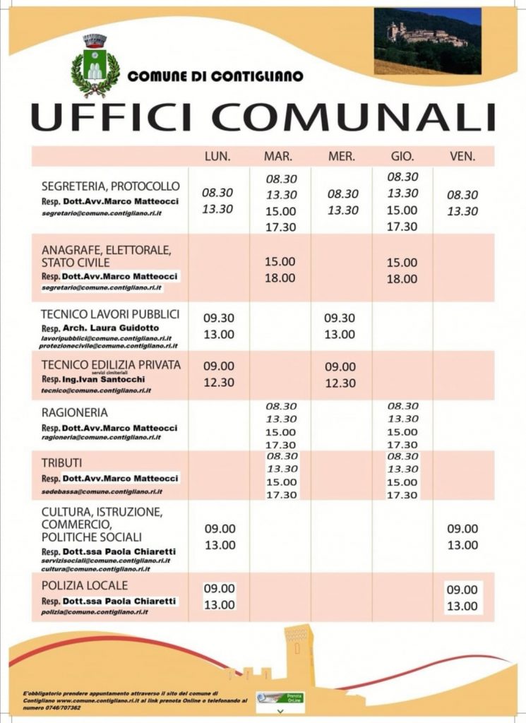 Contigliano – Al fine di programmare gli ingressi al pubblico, nel rispetto della normativa anti-Covid che prescrive che gli uffici pubblici possano ricevere solo per appuntamento, l’Amministrazione comunale di Contigliano si è dotata di un nuovo strumento per la prenotazione degli appuntamenti negli uffici della sede comunale, accessibile alla seguente piattaforma: https://contigliano.mycity.it/agenda-smart, con cui il cittadino potrà prenotare il giorno e l’orario che più preferisce per accedere ai servizi in totale sicurezza e con certezza dei tempi di gestione delle pratiche da parte degli uffici comunali.
