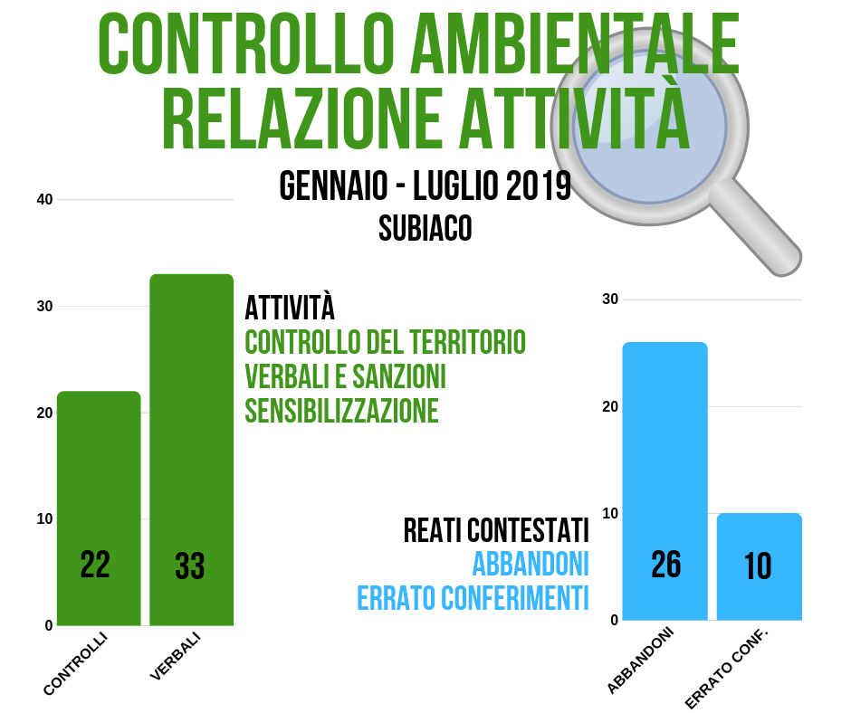 Centro urbano ed aree esterne, per un totale di oltre 60kmq, sono oggetto dei controlli congiunti di Polizia Locale e Guardie Ambientali, queste ultime in servizio presso la Città di Subiaco dal 2017, contestualmente all’avvio della Raccolta Differenziata Porta a Porta.