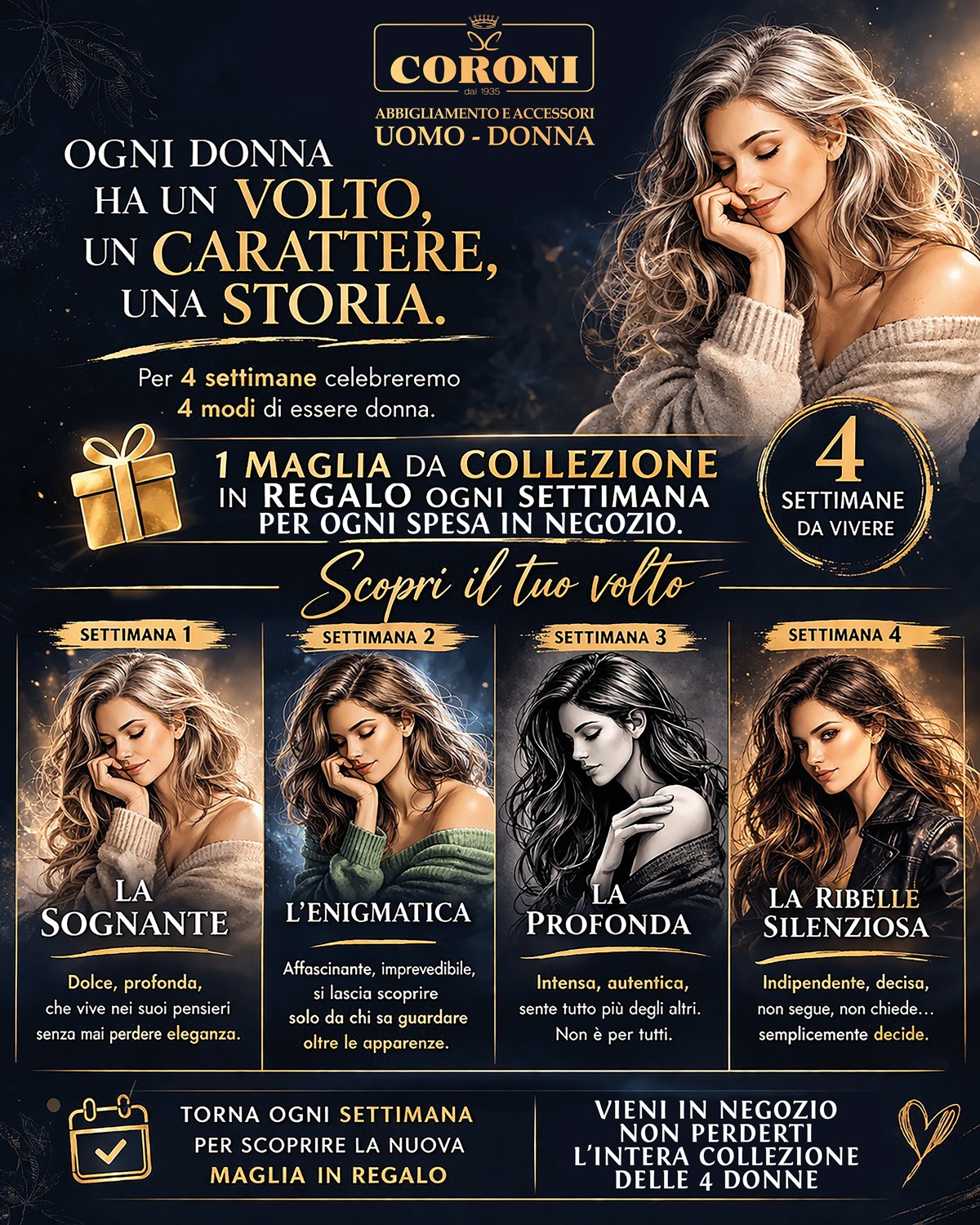 La prima settimana, incentrata sulla figura della “Sognante”, ha conquistato il pubblico con uno stile dolce e raffinato: capi morbidi, linee avvolgenti e un’eleganza che parla di introspezione e sensibilità. A rendere ancora più interessante l’iniziativa è la formula promozionale: ogni settimana, a fronte di una spesa in negozio, è possibile ricevere in regalo una maglia della collezione dedicata al tema in corso.