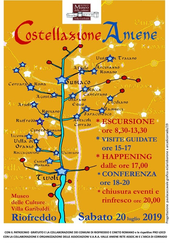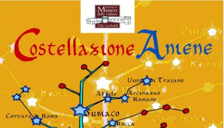 “Costellazione Aniene” è una ulteriore visione immaginaria della mappa dei borghi e delle cittadiine che formano la Valle .: l’Albero del Cammino dell’Aniene con la sua direttrice quasi interamente disegnata dal fiume, e le ramificazioni che conducono a borghi più addentrati o arroccati.Visioni immaginarie di  poeti, scrittori, pittori, scultori, fotografi, registi, attori, musicisti, cantanti che sollecitati dai luoghi , dalla storia, dalle presenze, dagli usi e costumi hanno nei secoli descritto e divulgato la Valle nel mondo…….