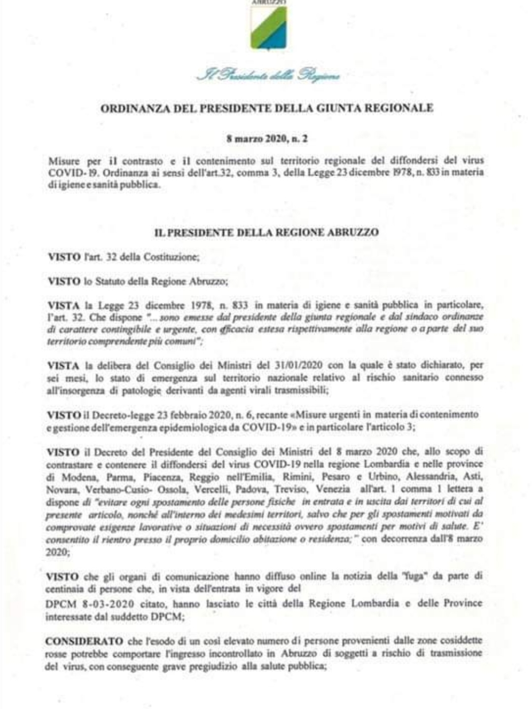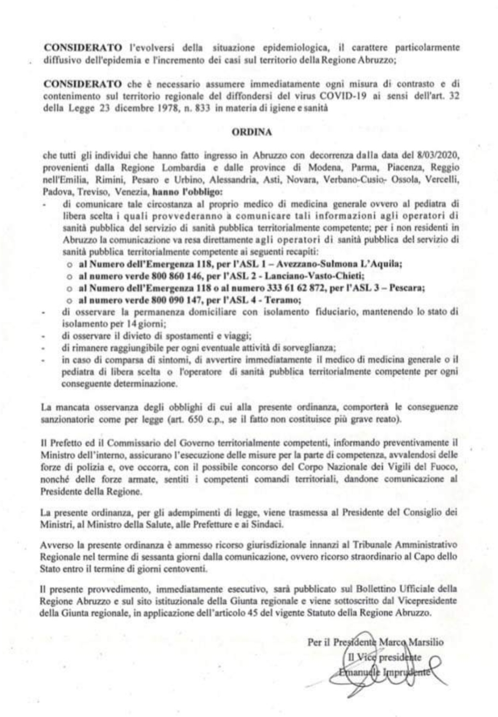 ❗️Abbiamo il dovere di tutelare la salute dei cittadini, e per questa ragione ho dato disposizione agli uffici di predisporre un’ordinanza, che a causa del mio momentaneo impedimento reca la firma del Vice Presidente della Giunta Emanuele Imprudente, che ❗️IMPONE la QUARANTENA a tutti quanti RIENTRANO in Abruzzo dalle zone elencate all’articolo 1❗️