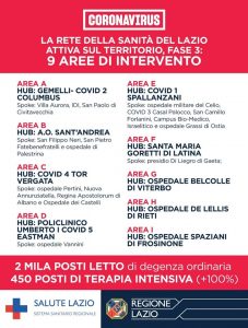 Sono state costituite 9 aree di afferenza: Area A – Hub: Gemelli- COVID 2 Columbus e Spoke: Villa Aurora, IDI, San Paolo di Civitavecchia; Area B – Hub: A.O. Sant’Andrea e Spoke: San Filippo Neri, San Pietro Fatebenefratelli e ospedale di Palestrina; Area C – Hub: COVID 4 Tor Vergata e Spoke: ospedale Pertini, Nuova Annunziatella, Regina Apostolorum di Albano e Ospedale dei Castelli; Area D – Hub: Policlinico Umberto I COVID 5 Eastman e Spoke: ospedale Vannini; Area E – Hub: COVID 1 Spallanzani e Spoke ospedale militare del Celio, COVID 3 Casal Palocco, San Camillo Forlanini, Campus Bio-Medico, Israelitico e ospedale Grassi di Ostia; Area F – Hub: Santa Maria Goretti di Latina e Spoke: presidio Di Liegro di Gaeta; Area G – Hub: ospedale Belcolle di Viterbo; Area H – Hub: ospedale De Lellis di Rieti; Area I – Hub: ospedale Spaziani di Frosinone.