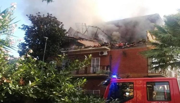 In via Atteone un'esplosione all'ultimo piano di una palazzina ha provocato un incendio. Al momento risultano tre feriti